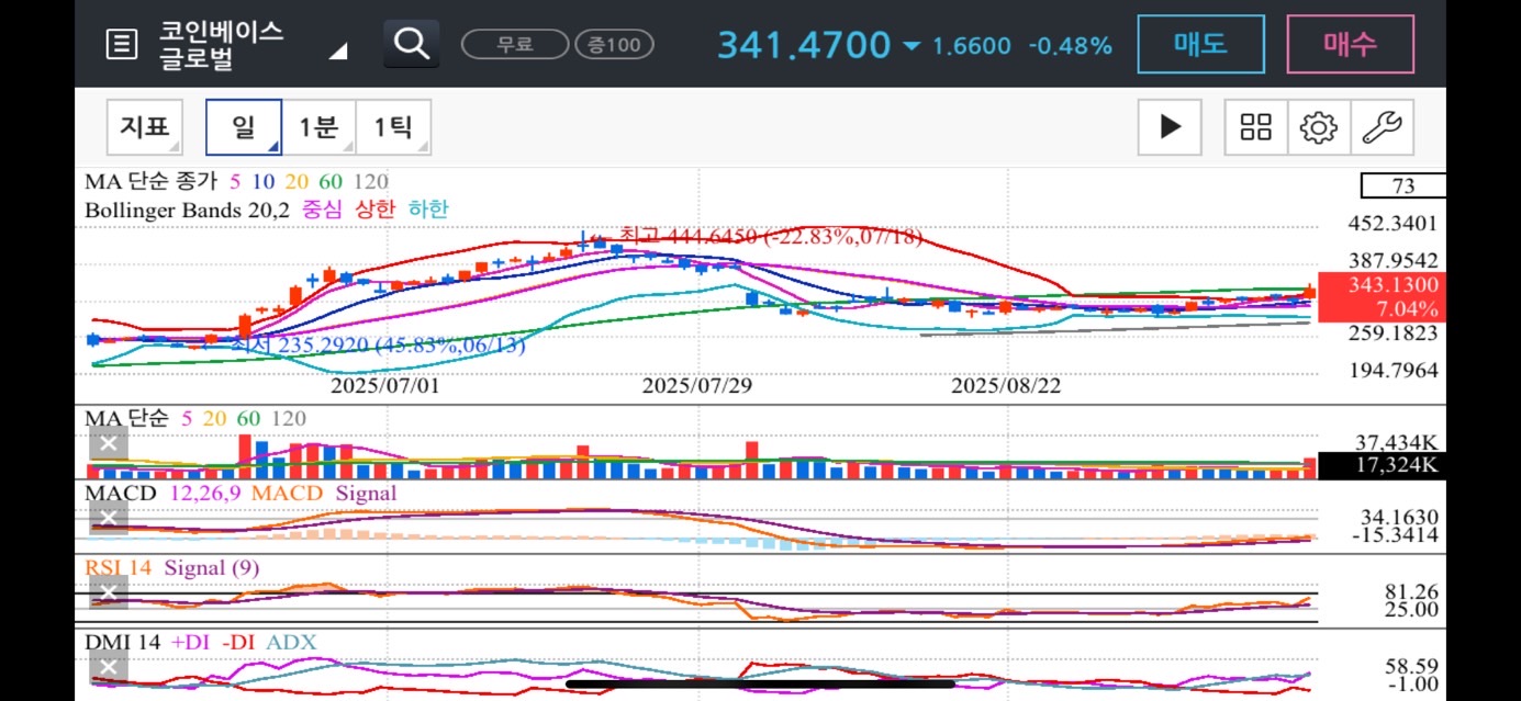 | 현재가 (25/09/22) | 341.47 | 이평선 밀집 구간 |